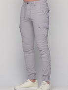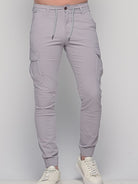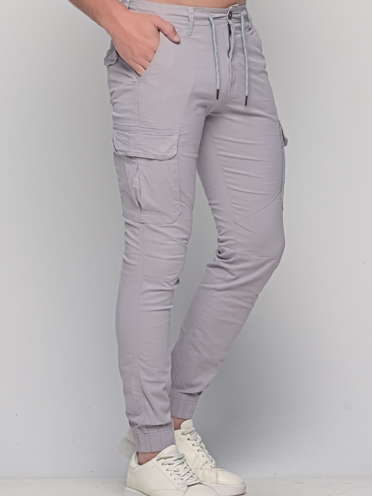 Υφασμάτινο παντελόνι, με εξωτερικές τσέπες, λάστιχο στα πατζάκια, κλείνει με κουμπί και φερμουάρ, κορδόνι στη μέση κι έχει στενή εφαρμογή.