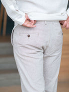Υφασμάτινο λινό ανδρικό παντελόνι με κουμπί και φερμουάρ και στενή εφαρμογή.