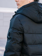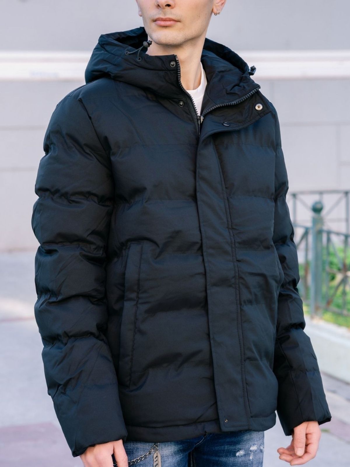 Aνδρικό μπουφάν με ενσωματωμένη κουκούλα, εσωτερική και εξωτερικές τσέπες, κλείσιμο με φερμουάρ και πατιλέτα με τρουκ, επένδυση πολυεστέρα, απλικέ σήμα και στενή εφαρμογή.