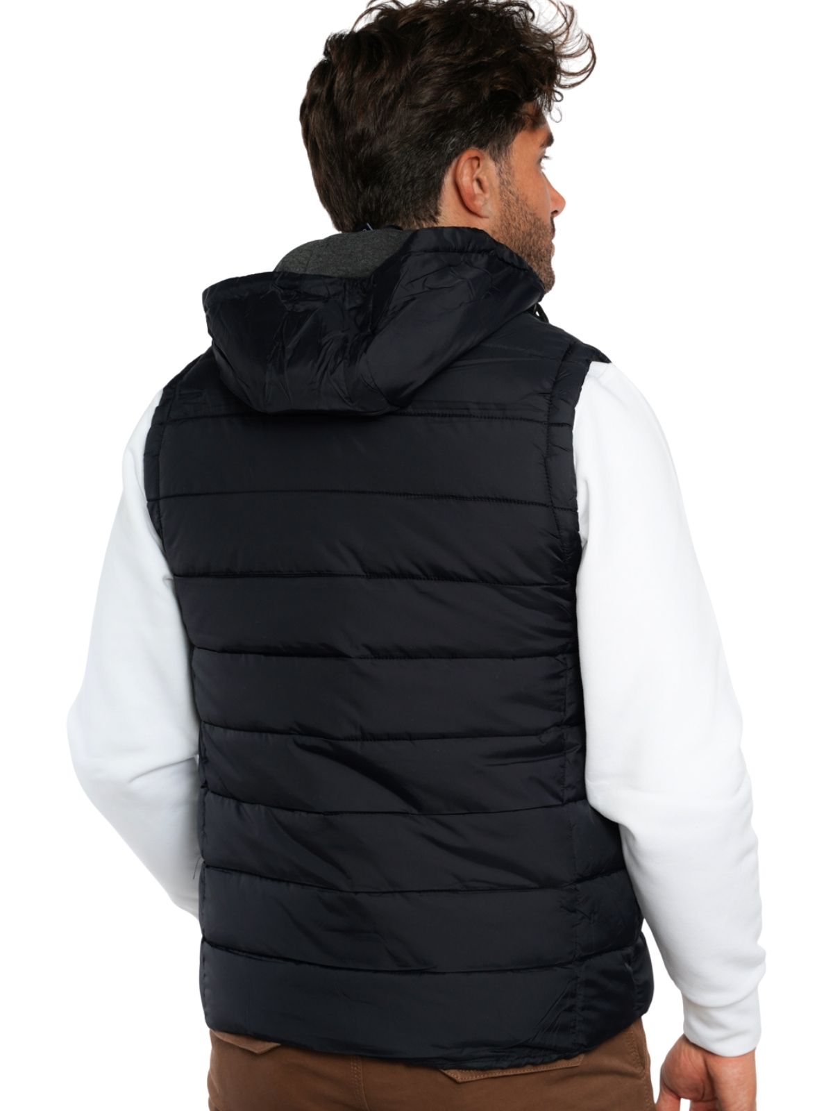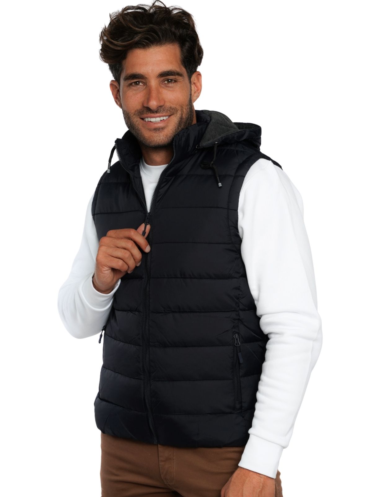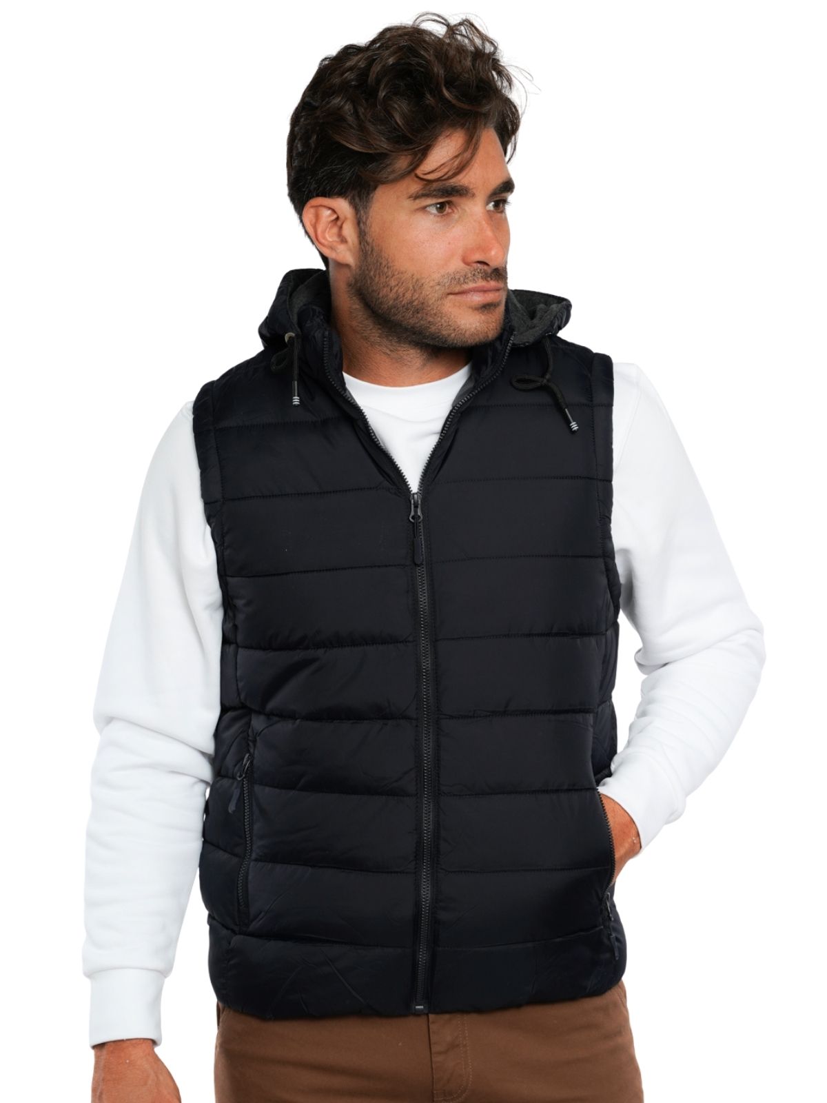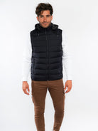 Μπουφάν αμάνικο με αποσπώμενη κουκούλα, εσωτερικές και εξωτερικές τσέπες, φερμουάρ και στενή εφαρμογή.