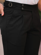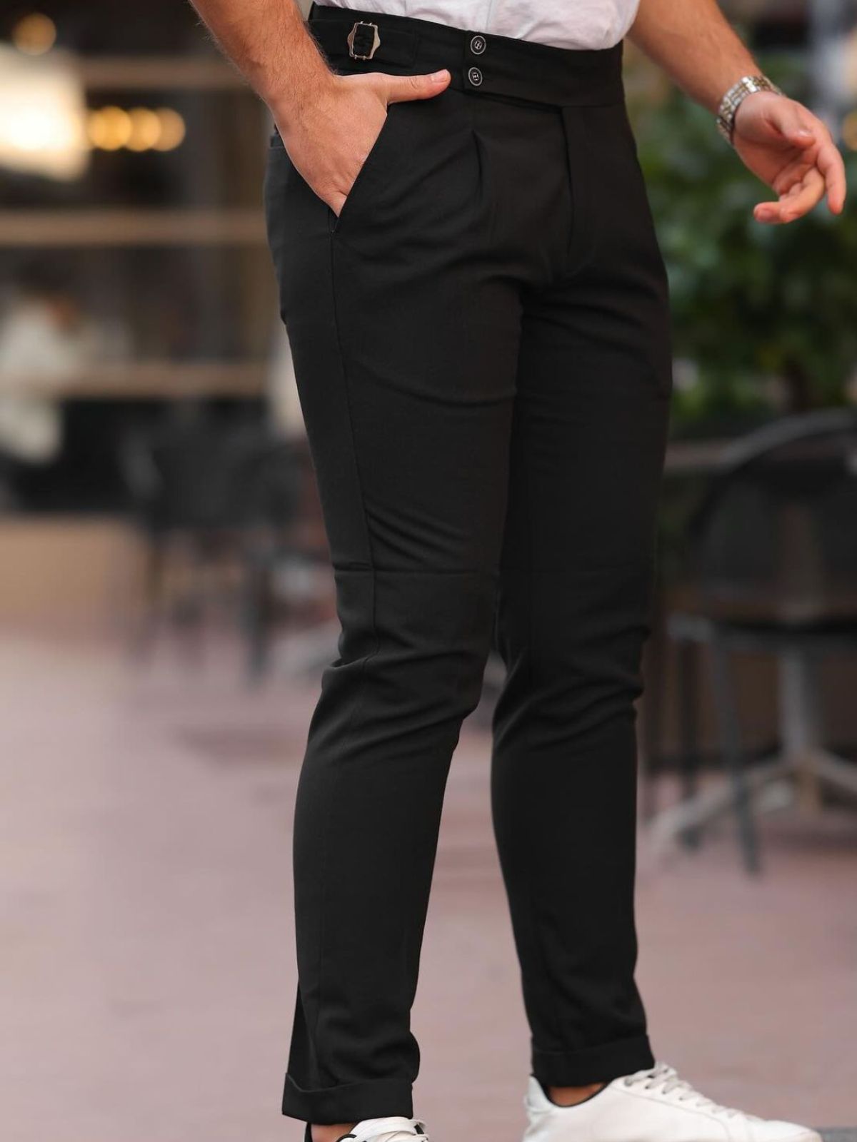Υφασμάτινο παντελόνι με τσέπες, κουμπιά και φερμουάρ, πιέτες, διακοσμητική αγκράφα σε στενή εφαρμογή.