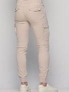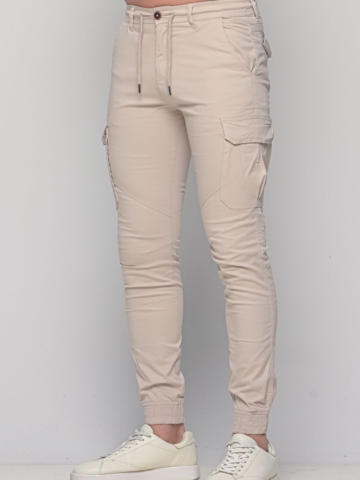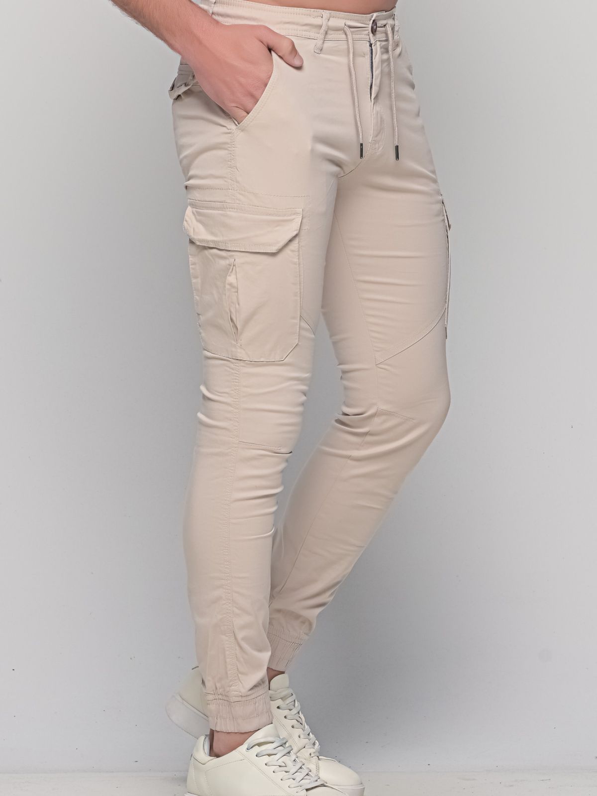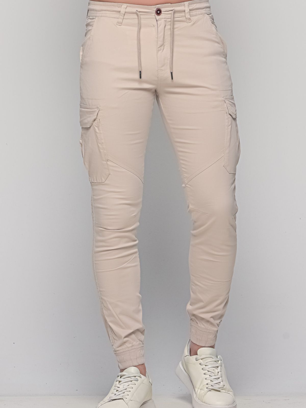 Υφασμάτινο παντελόνι, με εξωτερικές τσέπες, λάστιχο στα πατζάκια, κλείνει με κουμπί και φερμουάρ, κορδόνι στη μέση κι έχει στενή εφαρμογή.