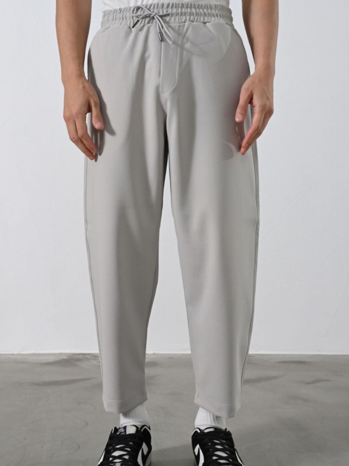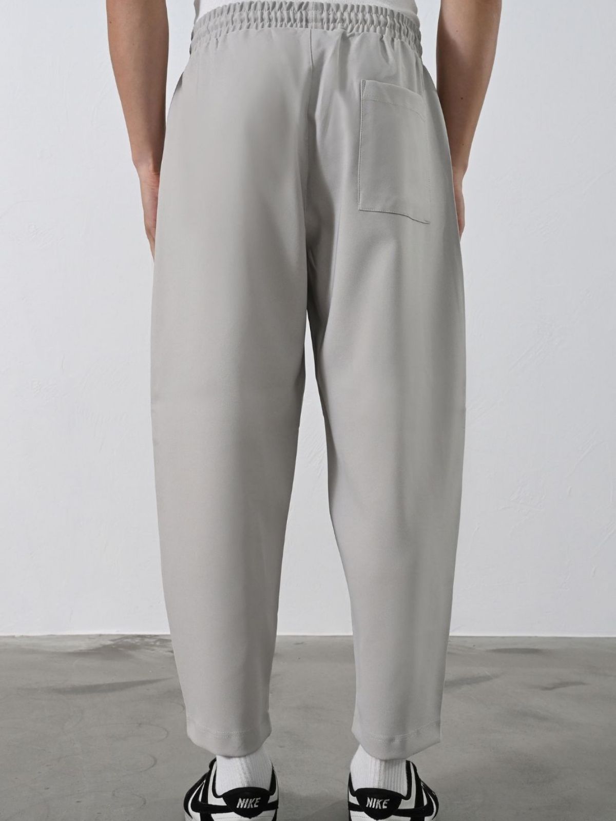 Παντελόνι με λάστιχο και κορδόνι στη μέση, τσ΄έπες στο μπροστά μέρος και μία μεγάλη στο πίσω σε κανονική εφαρμογή.